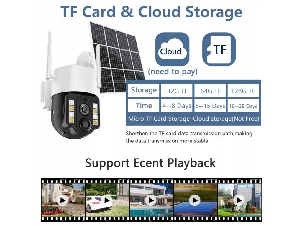 Cloudové úložiště: Cloudové úložiště (Poplachové video ) Místní úložiště: SD/TF karta (Max 128G)