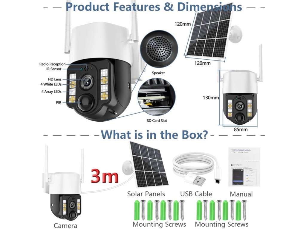 Balení obsahuje: 1 x 4G Solární kamera, 1 x solární panel, 1 x balení šroubů, 1 x USB kabel, 1 x držák solárního panelu,