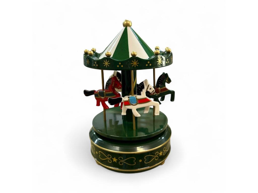 Kolotoč je vybavený původním hracím strojkem, který se rozehraje po natažení pérka. Natahování strojku jde zlehoučka a vaše děti si s ním hravě poradí. Po natažení se rozezní melodie a kolotoč se začne zvolna otáčet. Koníčky na tyčkách kolotoče můžete pohybovat kolem své osy.