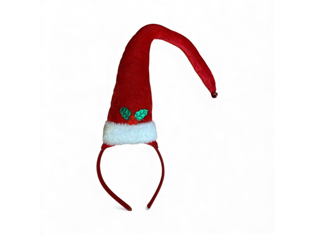 Mini čepička na čelence je z červeného materiálu, zdobená bílou kožešinou a rolničkou. Navíc ji zdobí dodatečná dekorace z jmelí pro vánoční akcent.