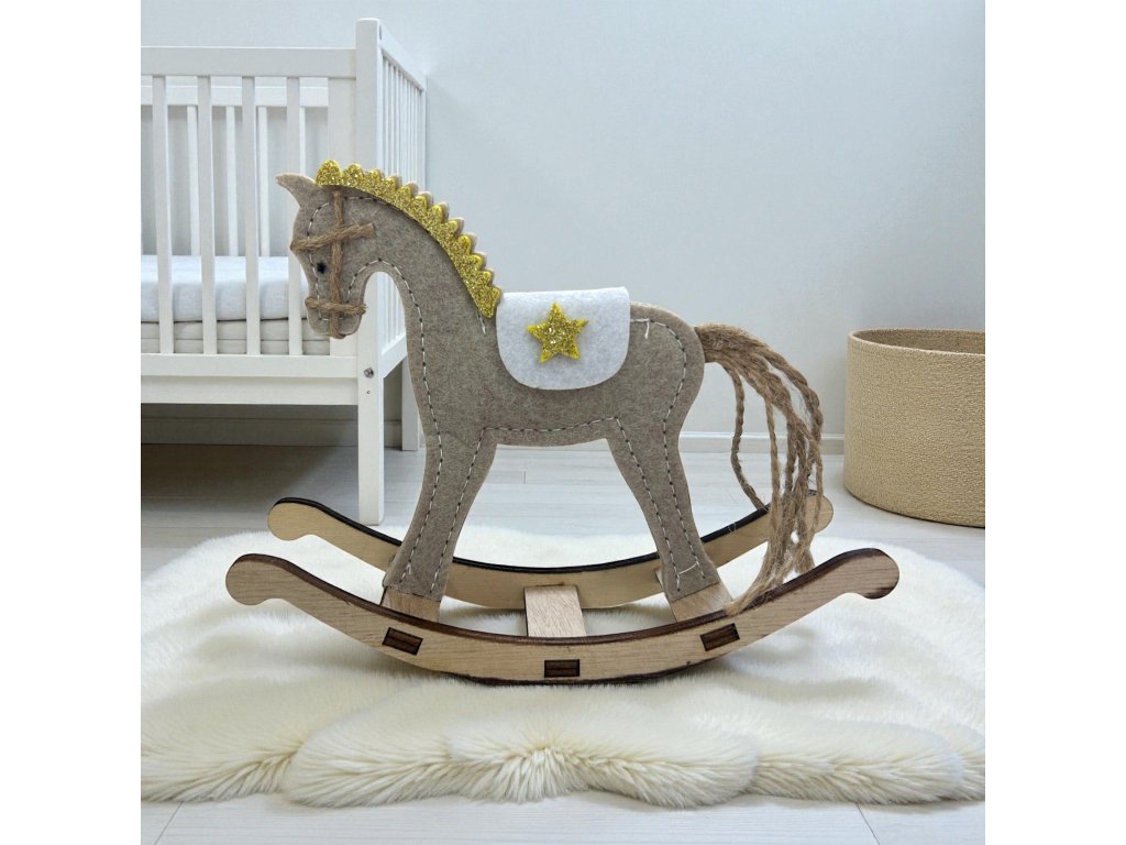 Tento kouzelný houpací kůň z plsti jako dekorace k postavení připomíná dřívější doby a i v dnešní době upoutá pozornost. Dekoraci můžete ozdobit vánočními větvičkami a vánočními koulemi a zaručeně se bude dobře vyjímat například na komodě nebo příborníku.