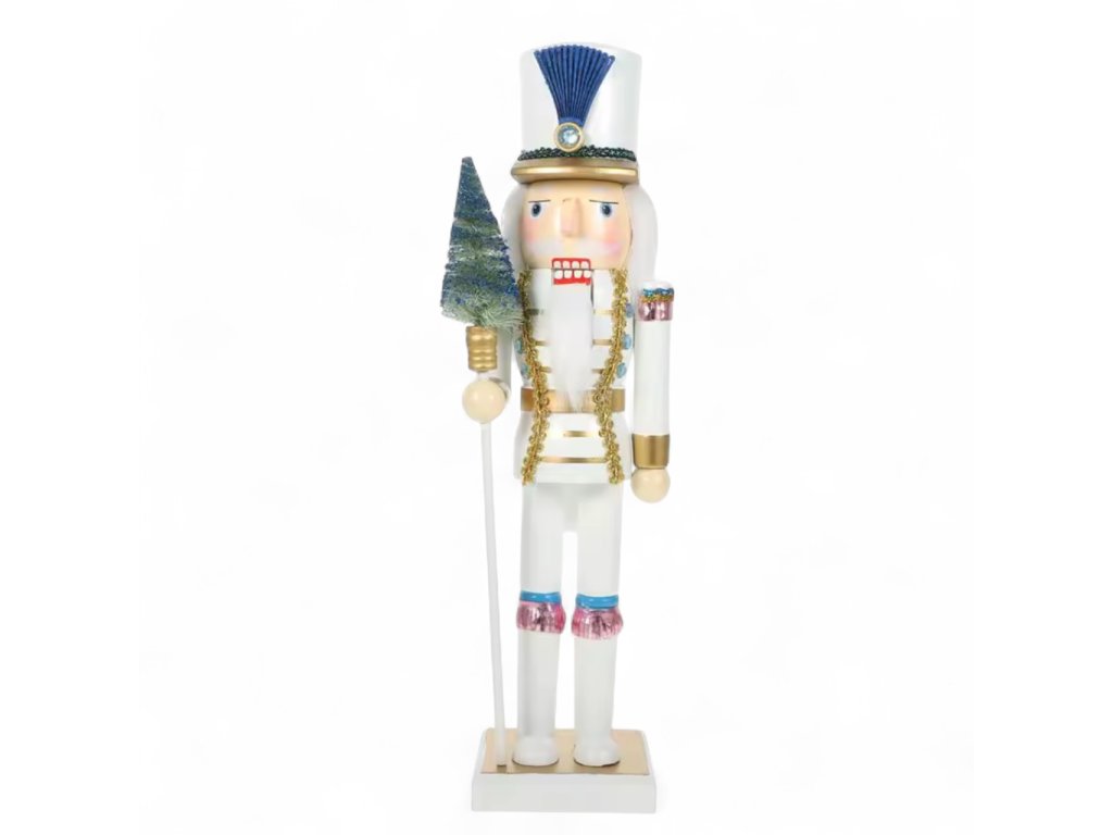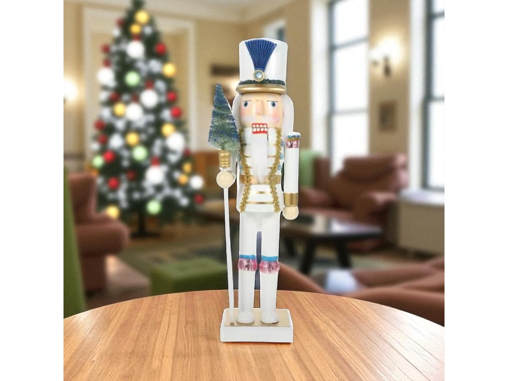 Vánoční dekorace louskáček - Bílo-zlatý s holí (40 cm)