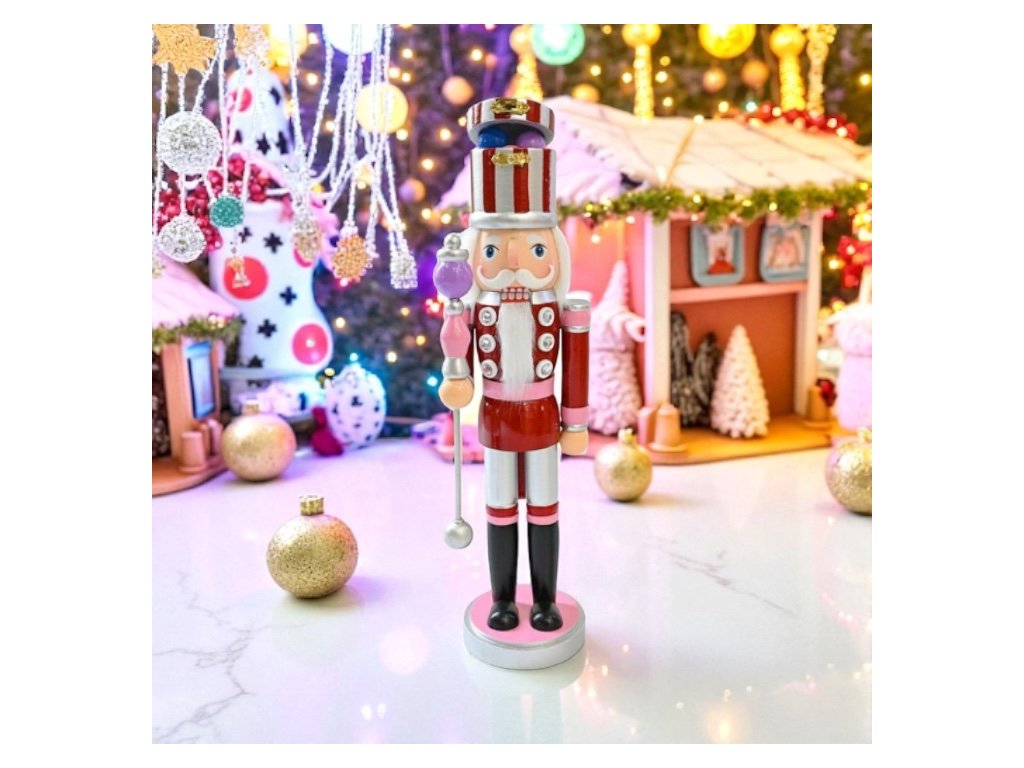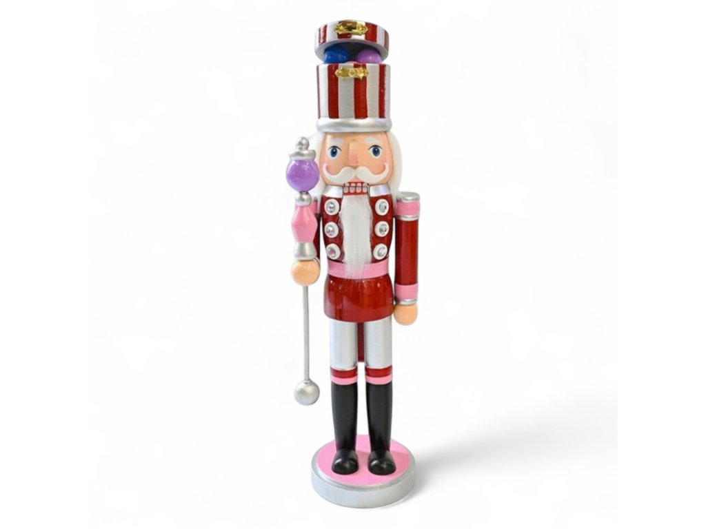 Vánoční dekorace louskáček - Červeno-stříbrný s holí (40 cm)