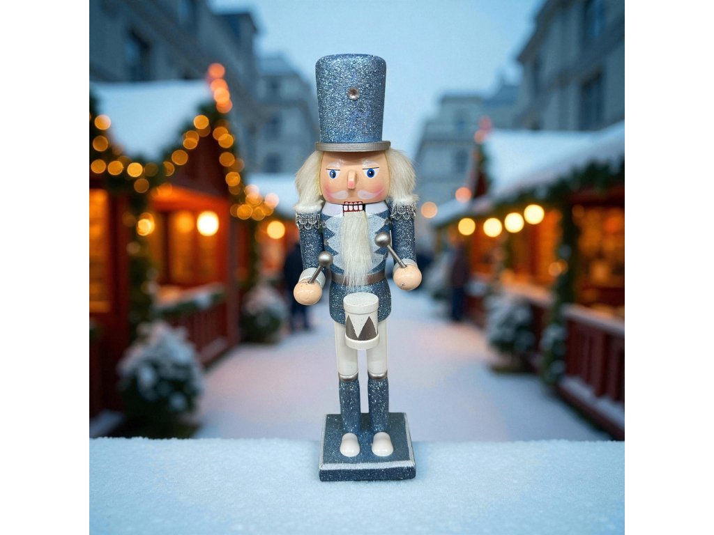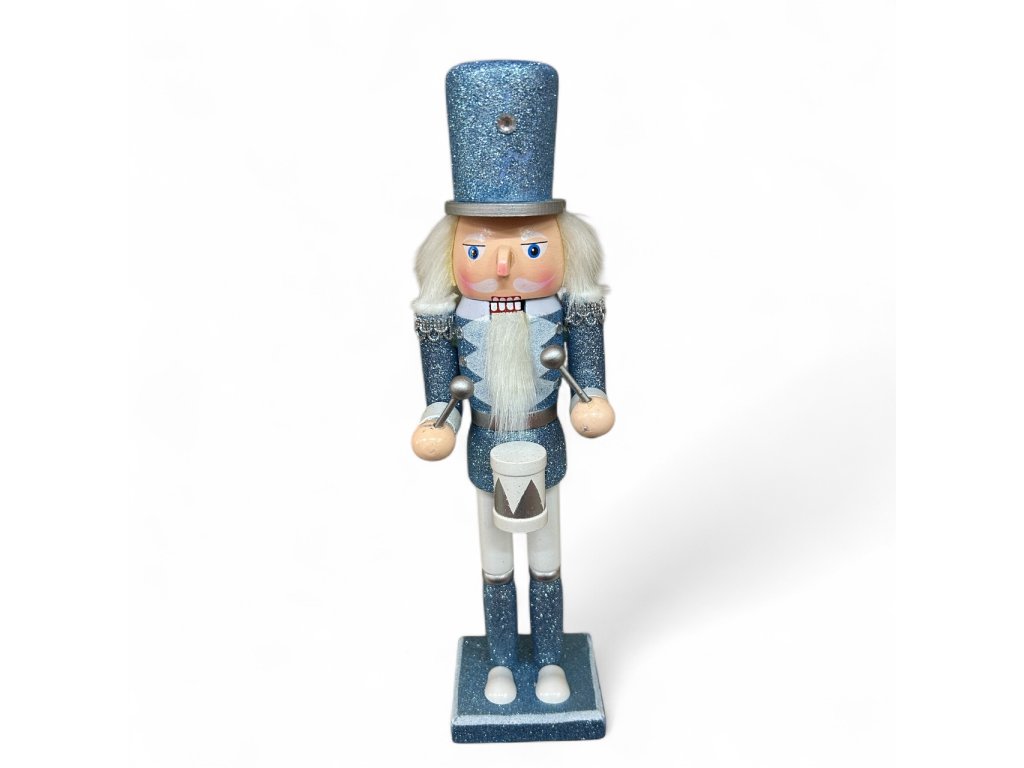 Vánoční dekorace louskáček - Modrý třpytivý s bubínkem (30 cm)