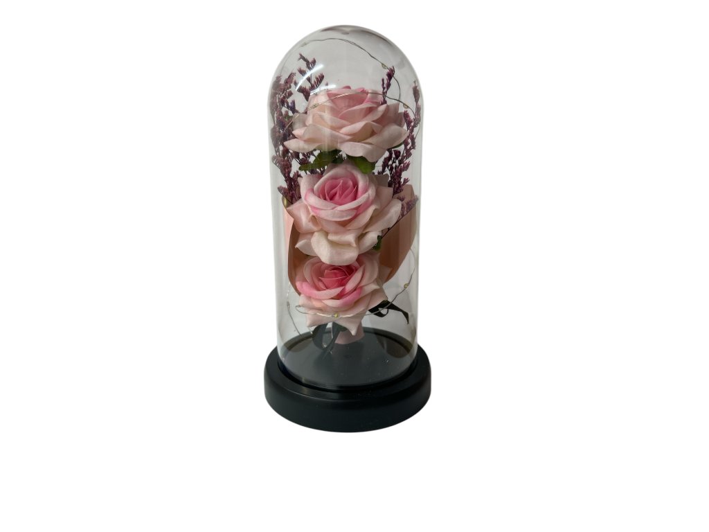 Květina ve skle je velmi detailně zpracovaná, díky tomu dosahuje realistického vzhledu. Díky LED světlům je krásně nasvícena, díky tomu se dá používat i jako lampička. Nemusíte ji udržovat, je vhodná pro alergiky. Ve skleněné nádobě je chráněna před prachem. Skvěle poslouží i jako dekorace do pokoje. V balení také najdete poukaz s květinovým motivem na který můžete napsat přání milované osobě.